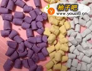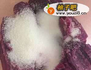 紫薯,地瓜,芋头去皮洗净,上锅蒸熟。以紫薯为例,300g蒸好的紫薯趁热加入50g糖,用勺子压成泥,加入约150g的木薯粉,揉成团。面团的状态应该是不粘手,也不太干。