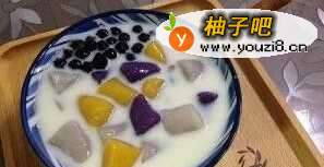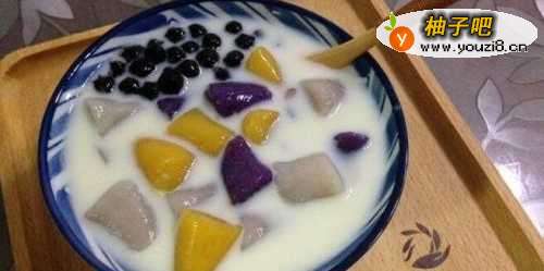 6碗里倒入牛奶,一勺红蜜豆,一勺珍珠,加入芋圆就可以吃啦!还可以根据自己的口味加入椰奶,水果之类,味道都很赞!