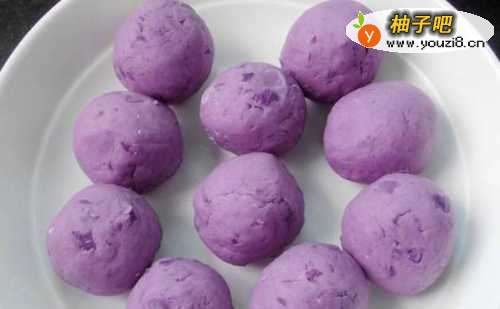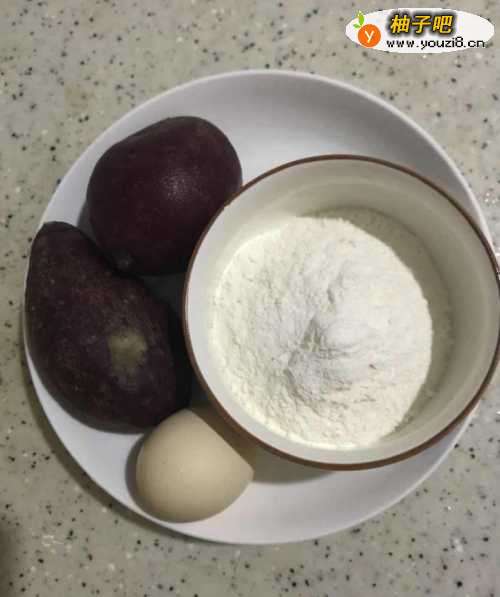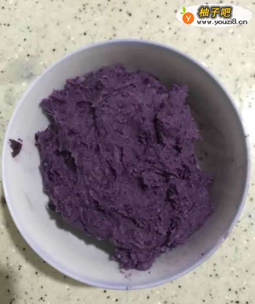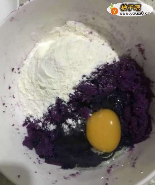 3第三步:将蒸烂的紫薯捣碎。在已经冷却的紫薯泥中加入准备好的面粉,并打入鸡蛋。(要等到紫薯冷了加面粉和鸡蛋效果更好哦!)