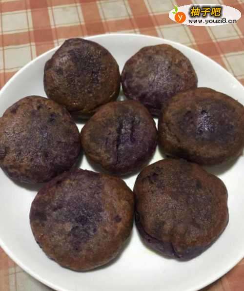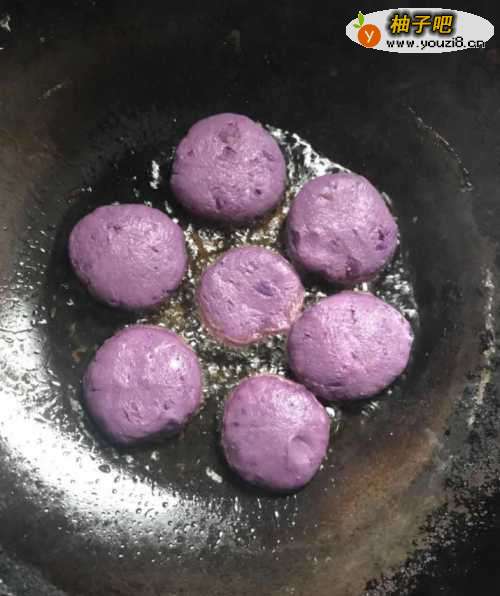 7第七步:将捏好的紫薯饼放入锅内油中,煎至两面金黄即可出锅罗!(煎的时候记得翻边哦!)