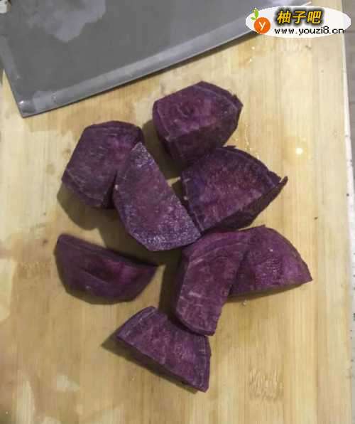 2第二步:将紫薯洗净,切小块放入碗中并将它蒸烂。
