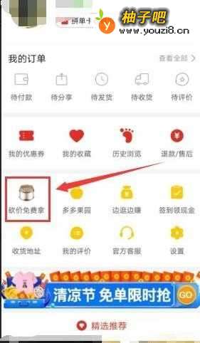 2此时进入图示内容页,上方显示登录信息,下方有我的订单,再下方为一排排图标,点击其中砍价拿按钮。