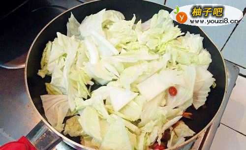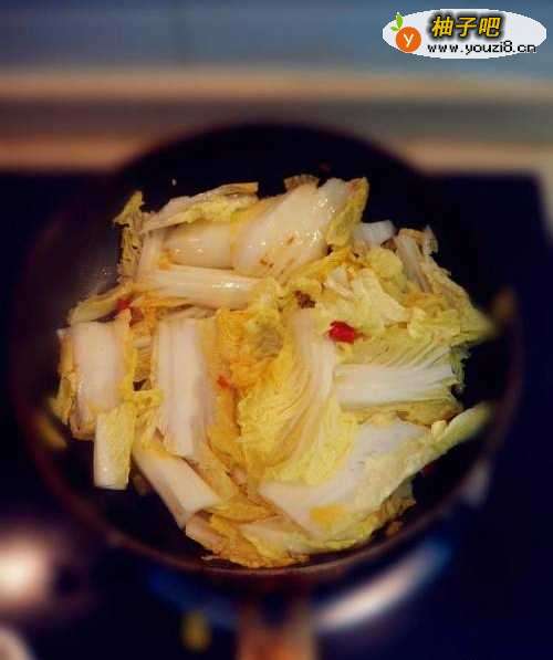 5将调料汁倒入锅中,大火翻炒几下白菜,让白菜蘸满调料汁就可以出锅了。