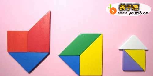 把九巧板准备好,可以每三块拼一个简单图形,先练下手,并数数九巧板的数目是否齐全,如下图所示。