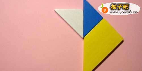 3接着,用一块橘色三角板,作为小山羊的脖子,并用紫色的三角板连接在梯形板上,拼接位置,如下图所示。