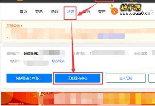 首先在已登录的阿里巴巴卖家中心【我的阿里】下方找到【旺铺】,在旺铺的下方打开【无线建站中心】,如图所示;