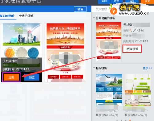 8在模板管理的下方点击【更换模板】,然后从免费的模板里找到我们刚刚购买的绿色模板,点击【应用】即可。