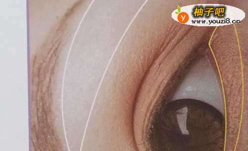 4使用米白亮色眼影打亮眉骨,注意金橘色与米白的色色界的融合,不要留空隙,再使用金橘色在下眼尾和眼头区域涂色,眼尾处要拉长加宽,眼头方向的颜色宽度要收细。