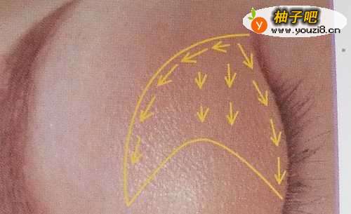 2使用海绵棒沾取金橘色眼影,从睫毛底部向上均匀晕染至眼窝部。