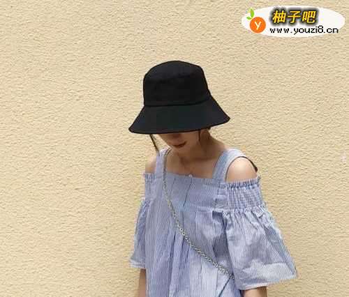 搭配三:黑色渔夫帽+黑色吊带裙+浅蓝色衬衫黑色吊带裙搭配一件浅蓝色衬衫,再配上一顶黑色渔夫帽,简约、大方又很显休闲范儿。