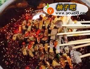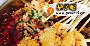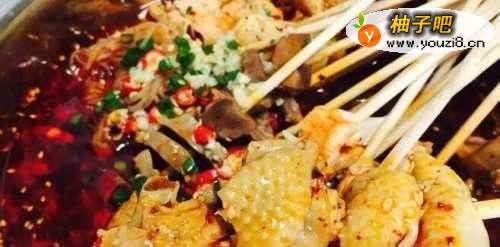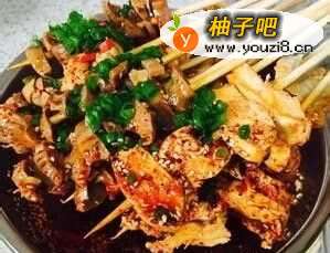 2鸡胗,鸡心,鸡翅膀,自己喜欢的菜都可以,先放荤菜,都要事先煮熟再串成一串串放入辣椒油里!