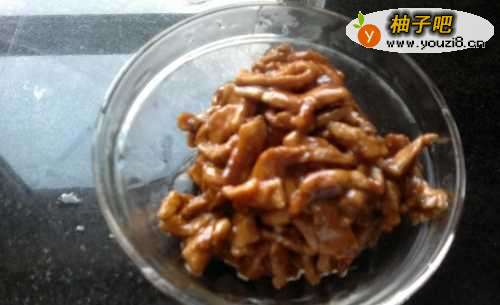 逐一将适量的食盐、马铃薯生粉、料酒、鲜酱油置入盛有肉丝的碗中。佐以各种配料目的:食盐:咸淡味;马铃薯生粉:外表爽滑不粘锅、不易糊锅;料酒:去腥增鲜;鲜酱油:增色、入味、提香。同时利于一定时间的保存、备用。