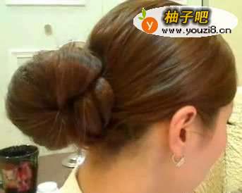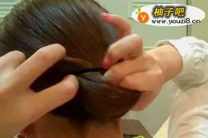 将头发扎成马尾,将尾部折进发圈中,绕成如图所示。用小卡子固定左右两侧。
