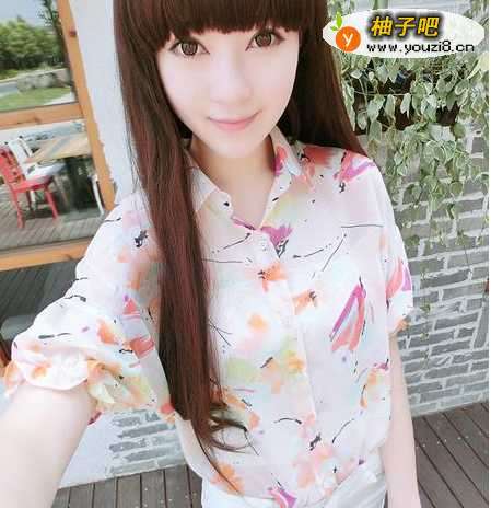 较为宽松版的清新花色透视雪纺衫,颜色和图案都是比较清新的,属于薄款雪纺衫,花苞袖口的设计,加大了立体感的表现,立领的领子设计带来韩系街头风的感觉,搭配一条低腰短裤就超赞了呢。