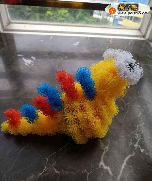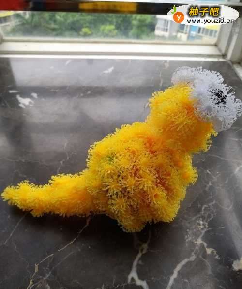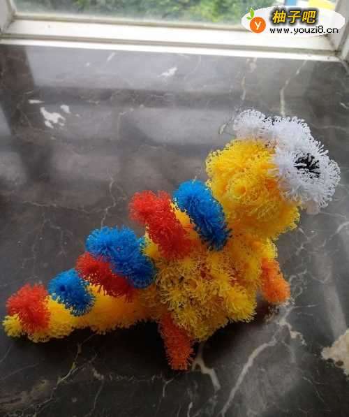 12把恐龙的腿粘好,一只蓬蓬球恐龙就做好了。