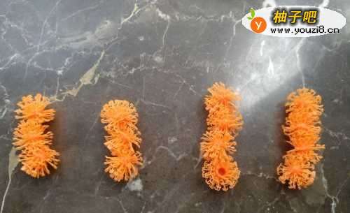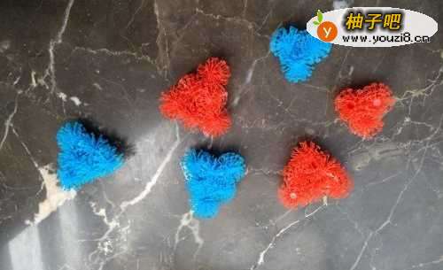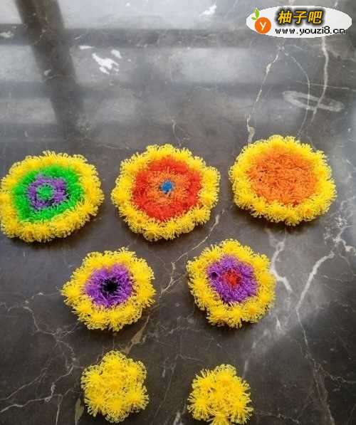 4做几个大小不一的圆形,中间填充的蓬蓬球可以使用任意颜色,但最外层的蓬蓬球都要用同样的颜色哦!