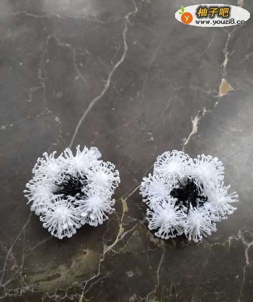 我们用白色的蓬蓬球把一个黑色的蓬蓬球围上一圈做两只恐龙的眼睛。