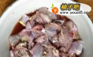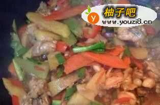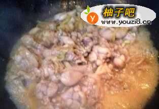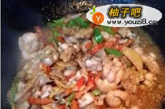 5炒制牛蛙。放牛蛙,加料酒,醋,糖,煮至水快干