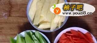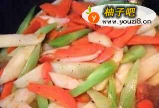 7炒配菜。牛蛙炒熟先盛盘,另起一锅,炒配菜。加盐,水,料酒,煮一会儿。想炒好就吃就煮熟,像边热边吃则大概可以就行