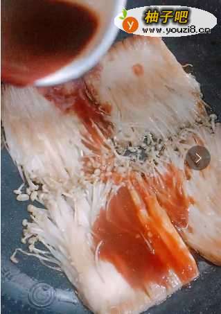 然后我们把酱汁倒入锅中的金针菇上,最好倒时均匀一点,然后放入孜然芝麻辣椒粉就可以了。