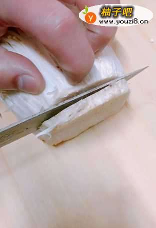 首先呢我们准备好金针菇一个,然后把金针菇洗干净之后去根,然后把金针菇立起来切大片,2到3厘米厚度是最好的。