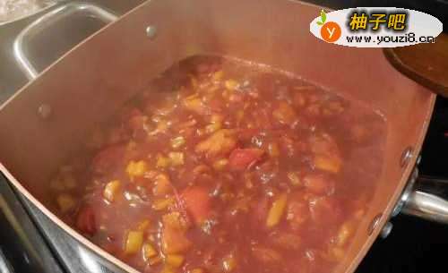 5番茄冒出汤汁之后,加入调味料与一杯冷水,煮滚