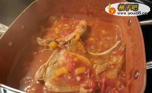 6将煎过的猪排下锅,与番茄汤汁同煮二十分钟,到猪排熟透即可,起锅前加点盐和胡椒等