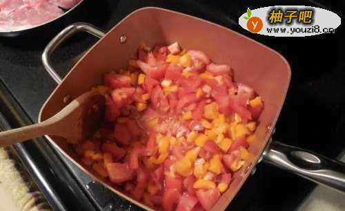 3大蒜与冷油下锅,炒出蒜香,番茄与甜椒丁下锅,翻炒到出水