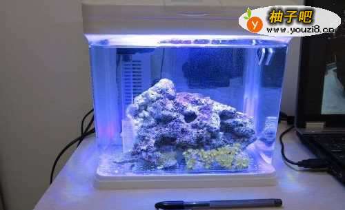 4之后将活石和沙砾布置在缸底,加入配置的海水,安装过滤系统,使之运行起来,然后安装LED灯,打开LED灯照射一段时间,使缸内长出藻类。其中藻类来源于活石!