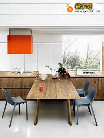 2一侧烹饪台上方的抽油烟机又将视线拉高,明快的颜色成为厨房里的点缀。统一的木色带来天然朴素的感觉,将餐厅和厨房合二为一。