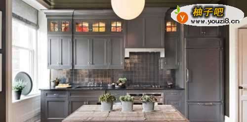 独立的木质餐桌立在厨房正中,打破了覆盖整面墙的灰色的沉闷感,选择四人位的方形餐桌,长度没有超过橱柜,在视觉上使空间看上去更大,桌面上的小型绿植盆栽点缀了自然的生机,令用餐环境更加轻松。