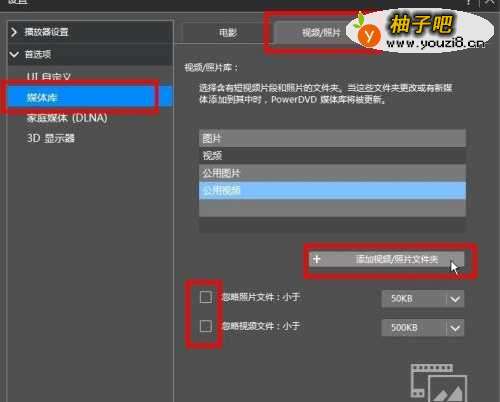 606-上方点 视频/照片,左边,媒体库,下方点 添加视频/照片文件夹,去掉 两框内勾选;