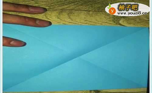 2将纸展开,我们再将另一对角对折,这样两个对角对折后,将方形纸展开,留下折痕。