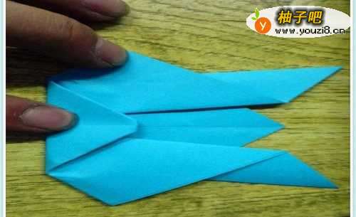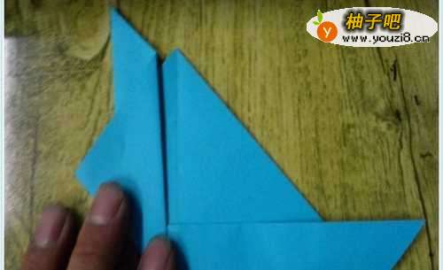 5接下来,我们折出小兔子的肚子,如图所示,将耳朵下部的三角形状,往上折一下。