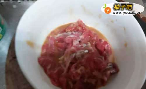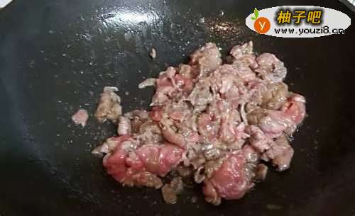 3平底锅加2大珠摸匙油,倒入牛肉片,炒1分钟,盛盘备用