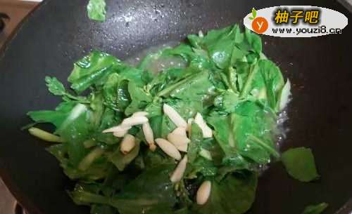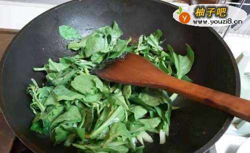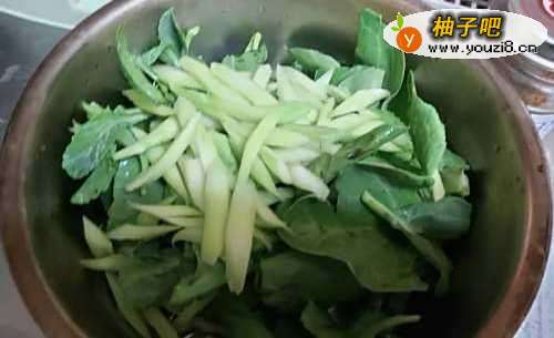 2芥蓝菜洗净,梗部刨去硬皮切段,叶片摘小片