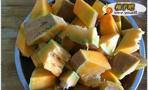4老南瓜洗干净,然后连皮一起切成段。备用。