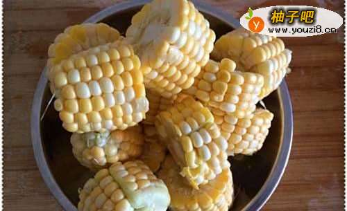 3玉米两根,切成小段,切小段点,这样吃的时候比较方便。小段些可以直接用筷子夹着吃