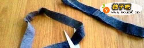 首先取一条旧牛仔裤的裤腿,用剪刀剪下25cm左右的长度,剪的时候,最好把裤腿角的那个地方留下来。