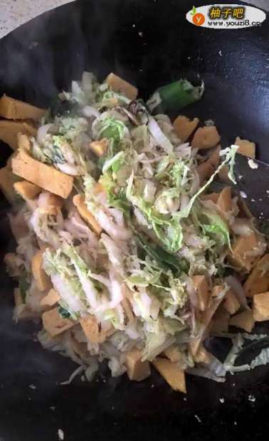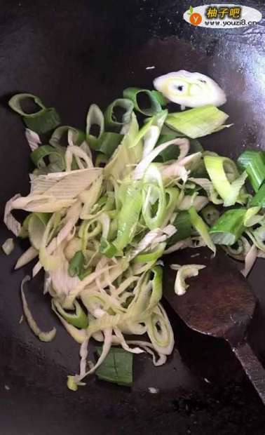 3先把葱放入油锅里炒几下,在放切好的白菜丝。