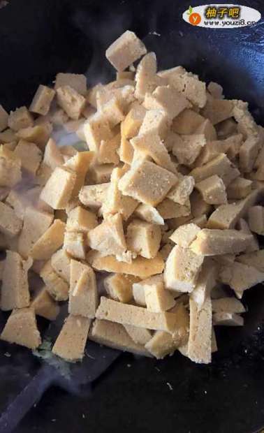 4然后把切好的窝头块放入锅中。