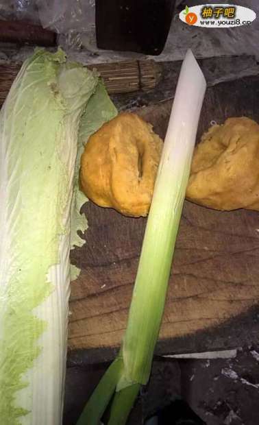 把葱白菜和窝头准备齐全。窝头切成一块一块的