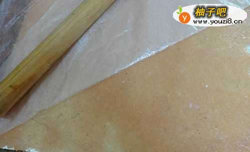 7取适量肉末放在锡纸上,上面盖上保鲜膜先用手摊开,再用擀面杖擀至薄透。