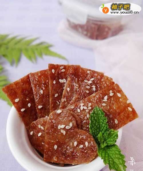 10接着入烤箱再烤10分钟,烤至猪肉脯变干,表面变黄。烤好放凉后用厨房剪剪片即可。