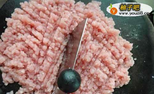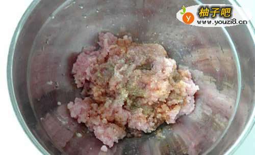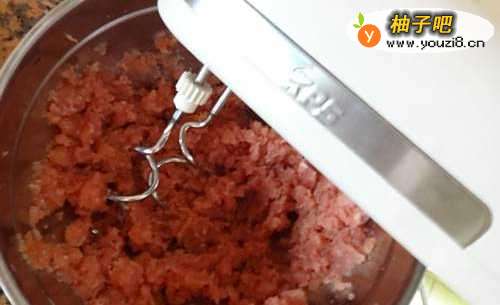 5用电动打蛋器搅几分钟,让肉起劲入味(要专门的和面打蛋器才行,如果没有的话可以用筷子顺一方向多搅一会儿)。