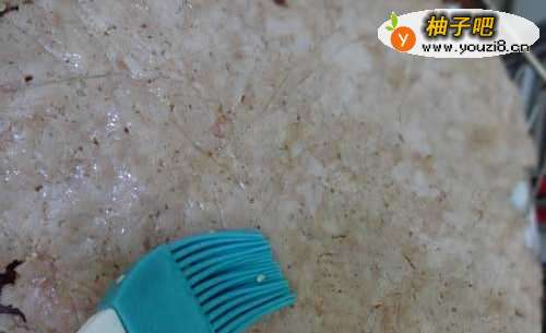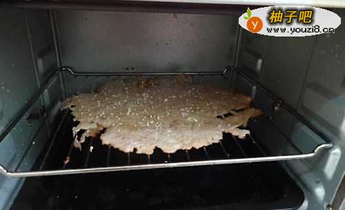 9中途取出(烤过的猪肉脯会比末烤前缩小很多),把猪肉脯倒扣在烤网上,撕下锡纸,在反面涮上蜂蜜水,撒上白芝麻。
