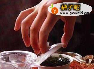 3把干茶放入茶壶,左右摇晃一下,用耳朵听听声响,声音较响,说明茶叶比较结实,茶粒较好。