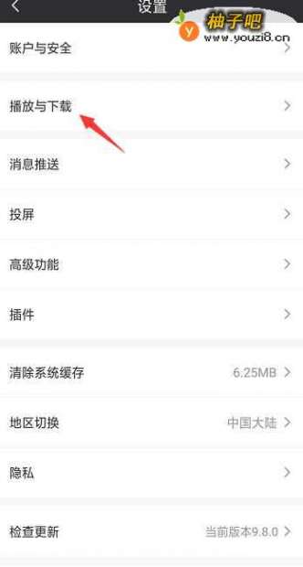 5打开设置的界面后,找到并打开【播放与下载】。如图所示