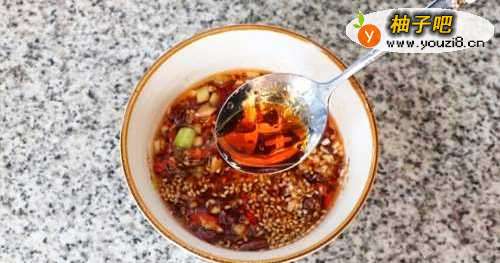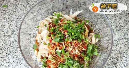 13将杏鲍菇撕成条,把做好的调料汁浇上去,再撒上葱花、香菜末