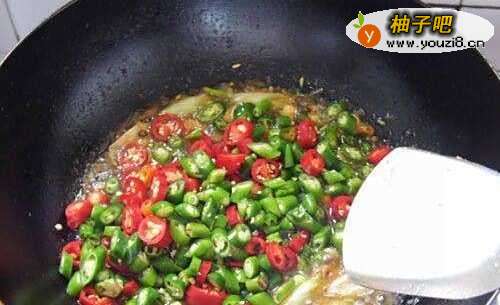 6下豆瓣酱,然后入泡姜泡椒,再多翻炒一会,下入美人椒和长尖椒